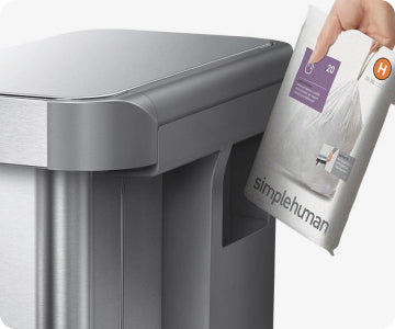 Store liners in the liner pocket, pull a fresh liner out from inside the bin, and close the liner rim to hide the liner and keep it in place.
